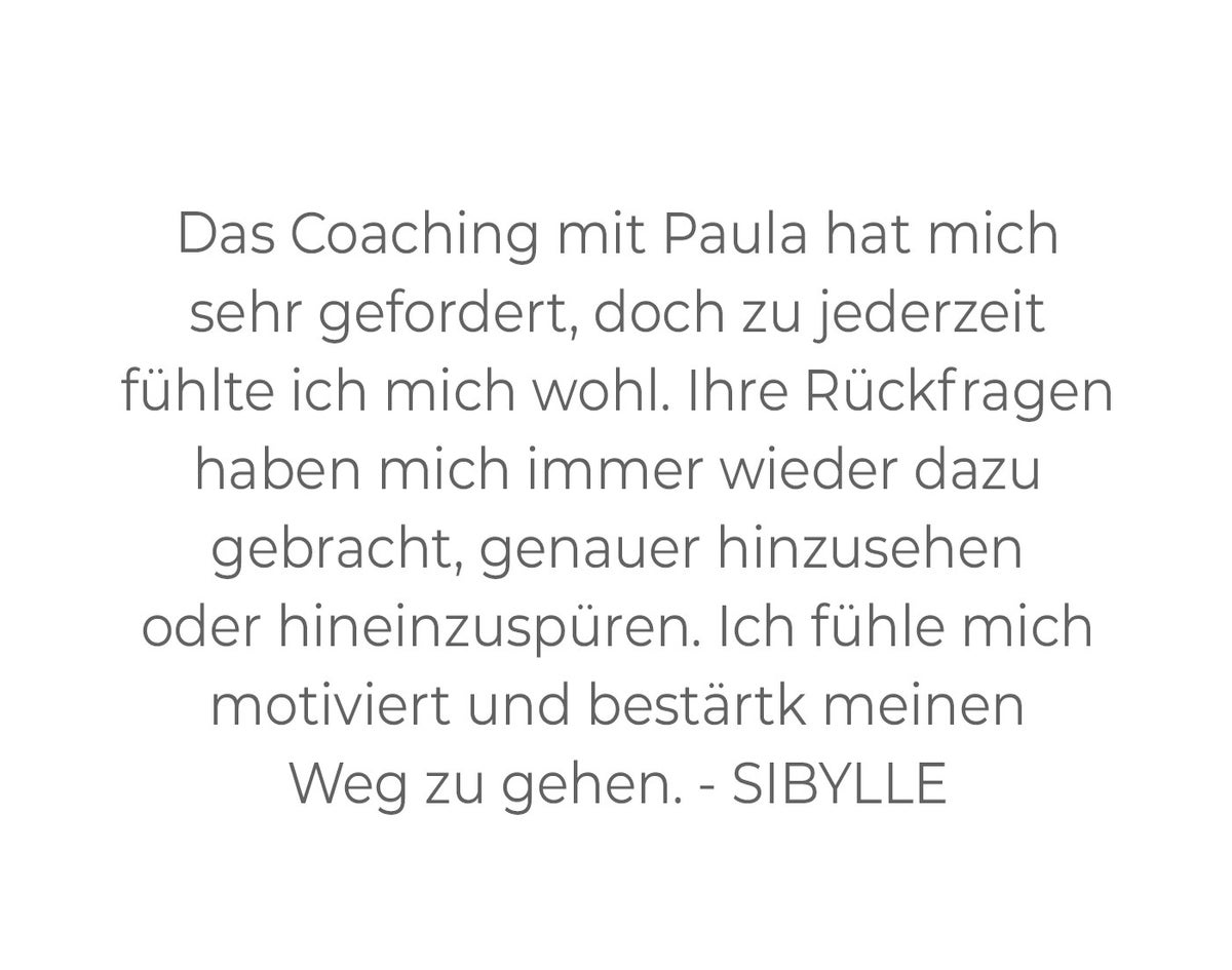Im Gespräch mit Paula fühlte ich mich von Anfang an verstanden, das Reden mit ihr fühlte sich so vertraut an. Sie hat so eine ruhige und positive Ausstrahlung. Wenn mir die Worte fehlten, um etwas zu erklären, konnte sie mich durch ihr einfühlsames Wesen gut unterstützen. Meine Anliegen für dieses Coaching hat sie mit mir zusammen aus verschiedenen Blickwinkeln betrachtet, mich auf dem Weg zu Lösungsmöglichkeiten begleitet und mit einem Koffer voll Werkzeug dazu ausgestattet. - Vielen lieben Dank für dieses wohltuende Gespräch. - MANUELA